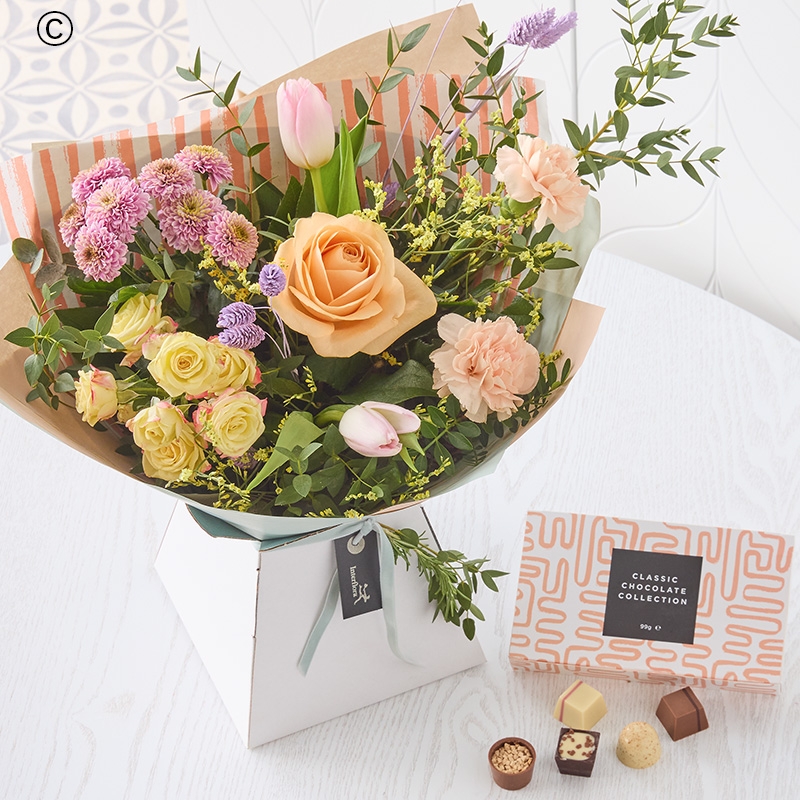 A handmade bouquet of fresh flowers in soft pastel shades, plus a selection of scrumptious chocolates. Using fresh and dried flowers and foliage in on trend soft, muted tones. Expect blooms in peach, lemon and lilac shades.